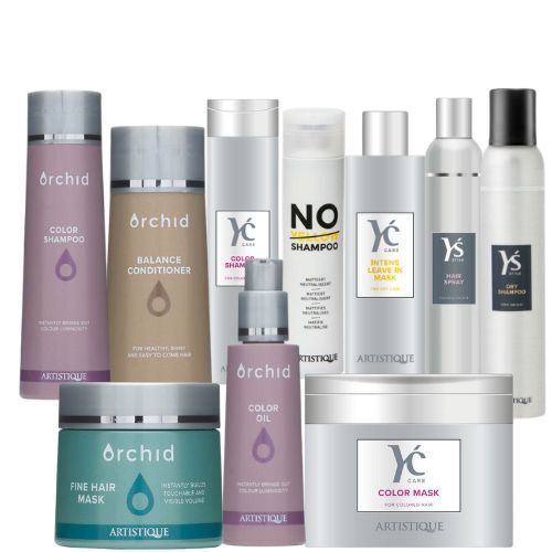 Orchid color šampón 300ml, Orchid balance kondicionér 300ml, Orchid fine hair mask 200ml, Orchid color olej na vlasy 75ml, No yellow šampón 250ml, YC color šampón 250ml, YC nezmývateľná maska 125ml, YC maska 350ml, YS lak na vlasy 400ml, YS suchý šampón.
