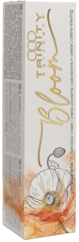 Krémové farby BLOOM Trinity haircare ponúkajú 120 odtieňov pre intenzívne, žiarivé a stabilné výsledky s Pigment-Boosterom PYRAZOL pre dokonalé krytie a zároveň ochranu vlasov a pokožky hlavy. Teraz NOVÉ, s vyšším podielom prírodných zložiek (90 %), úplne VEGÁNSKE a bez PPD, pre maximálnu starostlivosť o vlasy a udržateľnosť. Plne vegánska výživná formula so slnečnicovým olejom, vitamínmi A a B poskytuje vlasom a pokožke hlavy výživné zložky aj počas farbenia a chráni vlasy pred trvalým poškodením. BLOOM farby môžu byť použité ako permanentné aj semi-permanentné farby na vlasy. Dermatologické testy v laboratóriách dermatest® (rating A) potvrdzujú mimoriadne vysokú ochranu vlasov a pokožky hlavy.